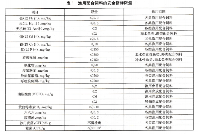 3.2安全指標(biāo) 漁用配合飼料的安全指標(biāo)限量應(yīng)符合表1規(guī)定。